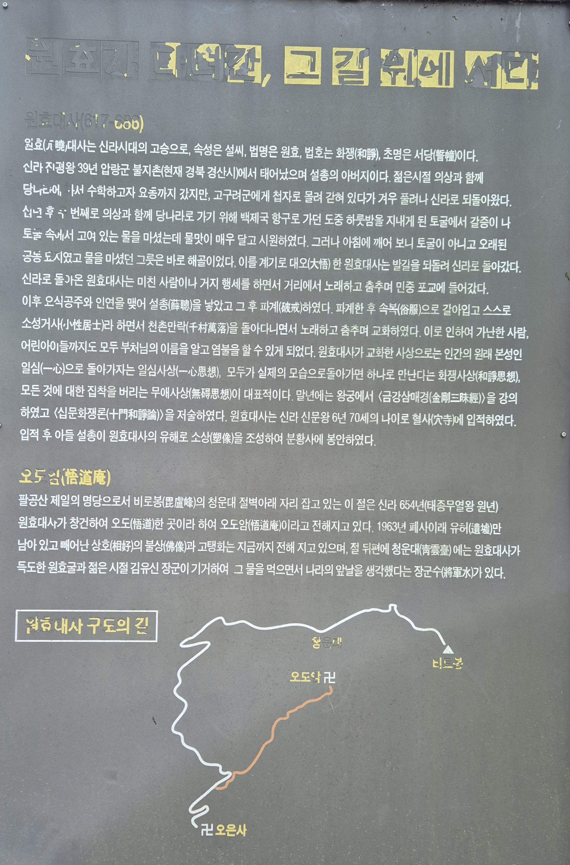 경북 군위군은 원효스님의 발자취를 좇아 오도암-청운대-하늘정원으로 이어지는 ‘원효구도의 길’을 조성하여 2017년